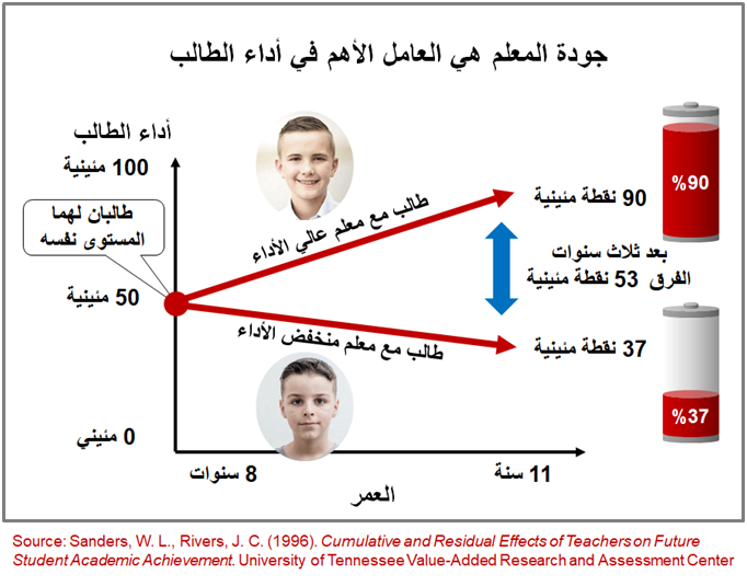 الشكل يبين الفرق بين طالب مع معلم عالي الأداء، وطالب آخر مع معلم منخفض الأداء. نلاحظ أن الفرق في أداء الطالب يبلغ 53 نقطة مئينية (Percentile) بعد ثلاث سنوات، وهو فرق كبير جدا.